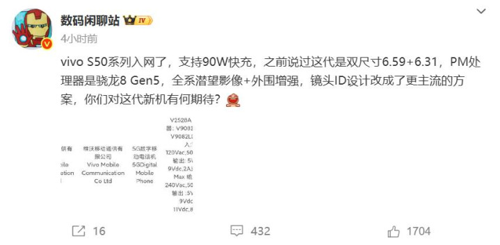 vivo s50系列已经入网,发布时间大概是12月前后,此次会带来两款手机,高配版依然是6.31英寸小直屏,vivo s50 pro mini这次会越级搭载骁龙8 Gen 5处理器,性能上大幅提升,跑分大概是330万左右。