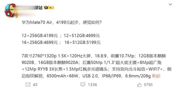 华为mate 70 Air已经上架,起售价4199元,高配版要5199元,说实话这个定价确实比之前的机型更亲民一些,不过处理器上有一些削弱,据博主数码闲聊站爆料,12GB版本用的是麒麟9020B、16GB版本用的是麒麟9020A。